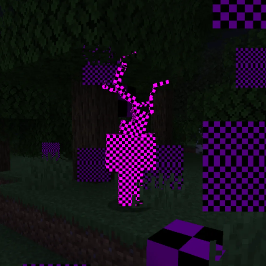 Notexture is a player-sized entity with a fractured head - one quarter of it is missing, and half of it is grown into a branching, antler-like structure. Its entire body is missing textures, with the usual pink and black pattern, hence its name. It will slightly jitter at all times, as well as emitting a cloud of